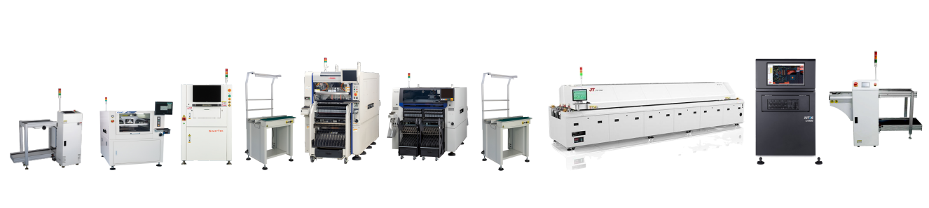 全自動(dòng)上板機(jī)→ 全自動(dòng)印刷機(jī)GKG GSE→思泰克SPI →接駁臺(tái) →YSM40R→ YSM20→ 接駁臺(tái)→ 勁拓回流焊→ 矩子在線AOI → 下板機(jī)(從左→ 右)