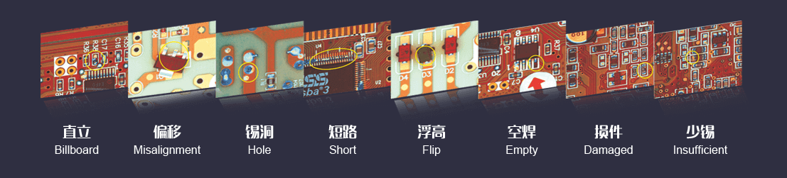 | 檢測(cè)覆蓋類型 | 偏移、少錫、短路、污染、缺件、歪斜、立碑、側(cè)立、翻件、錯(cuò)件、破損、浮高、極性、虛焊、 空焊、溢膠、錫洞、引腳未出等 |
