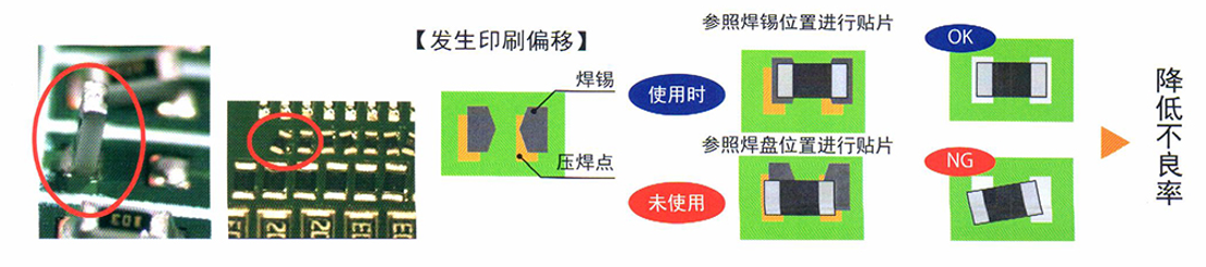 通過貼片機(jī)內(nèi)的OCC相機(jī),識(shí)別出焊錫印刷的位置偏移,參照焊錫位置補(bǔ)正貼片坐標(biāo)位置,降低了因焊錫印刷位置偏