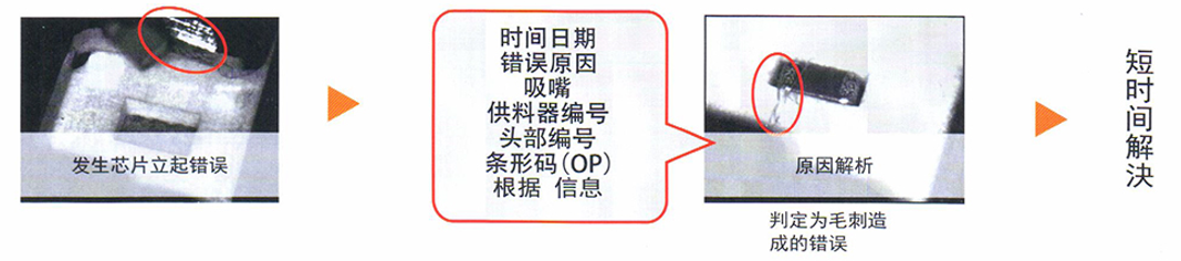 過在貼片頭部?jī)?nèi)安裝超小型攝相機(jī),可以實(shí)時(shí)取得吸取/貼片的圖像,實(shí)現(xiàn)了吸取與貼片時(shí)的檢查,還能保存追溯信息。